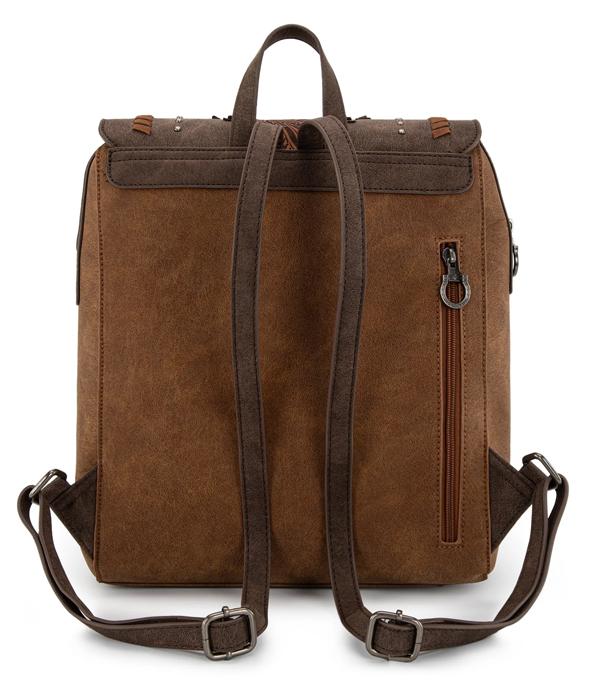 • Aztec and floral tooled applique on the flap with magnetic button closure