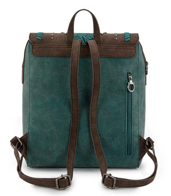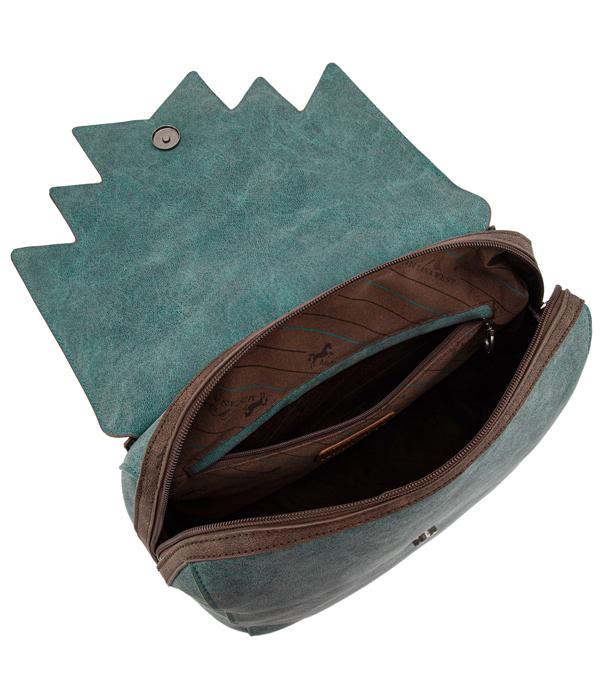 • Aztec and floral tooled applique on the flap with magnetic button closure