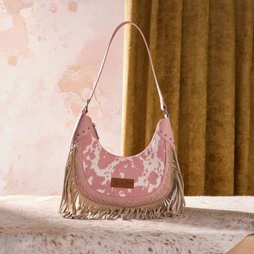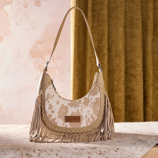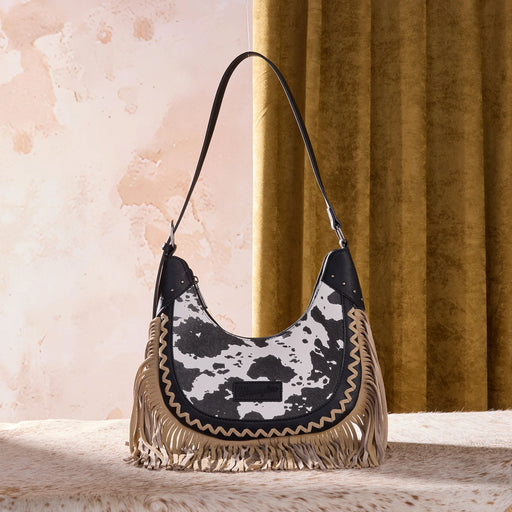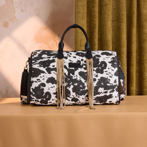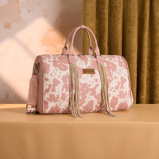 Cow print design Wrangler logo patch on frontwg90 Decorative whipstitch trim Long suede fringe detailing Top zipper closure Interior includes a zi...