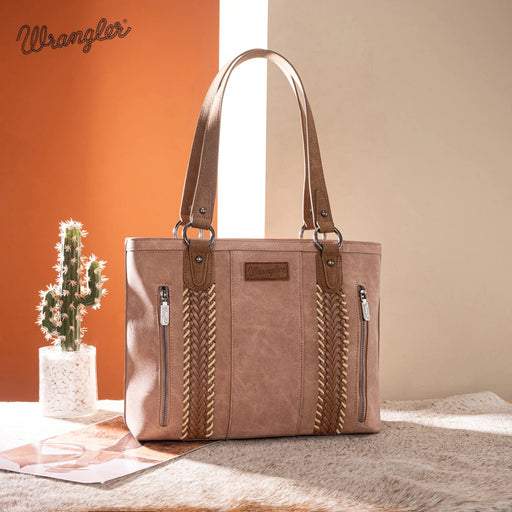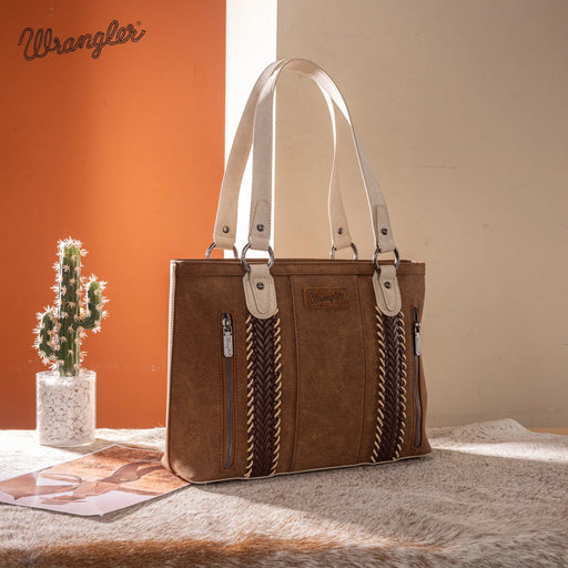 Braided panels with whipstitch detailing Wrangler logo patch on front Top zipper closure Inside a single compartment divided by a medium zippered...