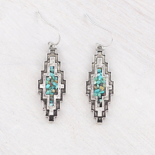 Turquoise Semi Stone Aztec Earrings.Approx: 2" drop.Casting hook.Lead & nickel compliant