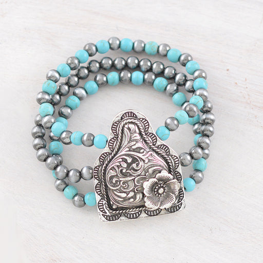 Floral Tooling Cattle Tag Bracelet .Stretch.Lead & nickel compliant