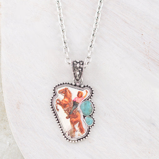 Vintage Cowgirl Pendant Necklace .Approx size: 18".Lobster claw closure with extending hooks.Lead & nickel compliant