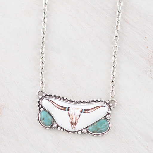 Cow Skull Turquoise Necklace .Approx size: 2" x 1" .Lobster claw closure with extending hooks.Lead & nickel compliant