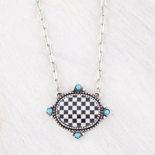 TIPI Turquoise Checkered Pendant Necklace.Approx: 18" .Pendant size: 1.5" x 1.25".Lobster claw closure with extending hooks.Lead & nickel compl...