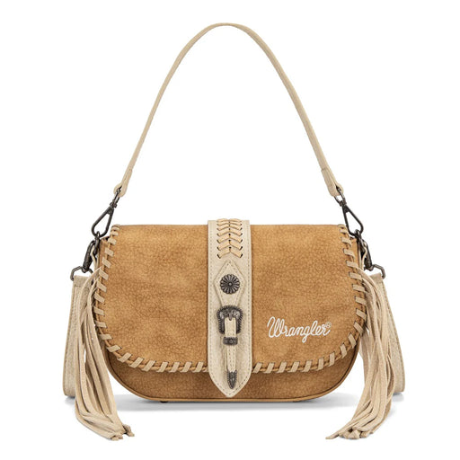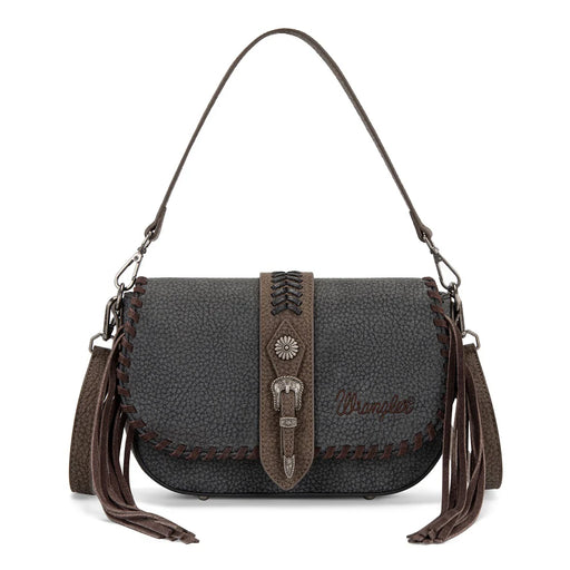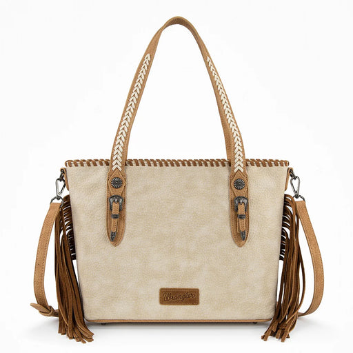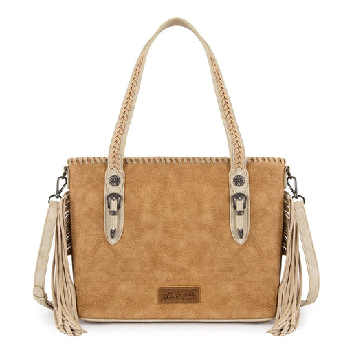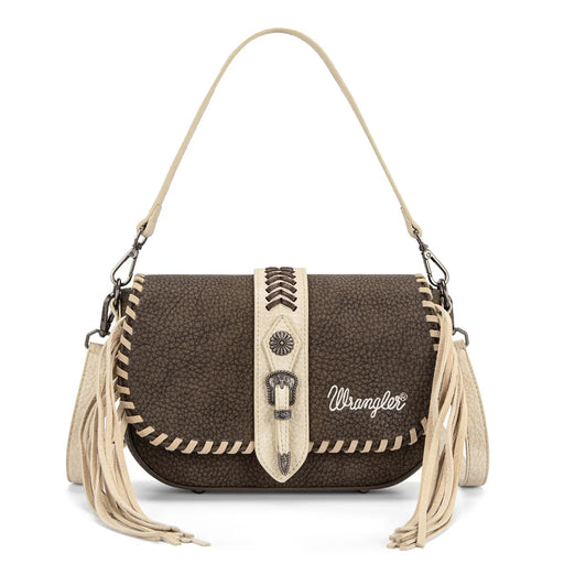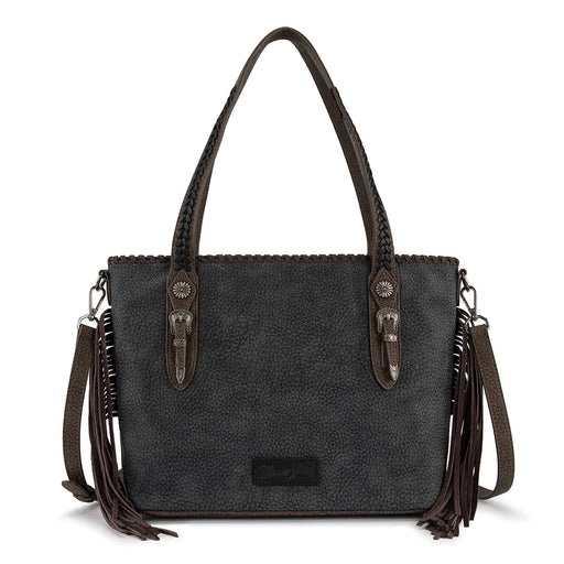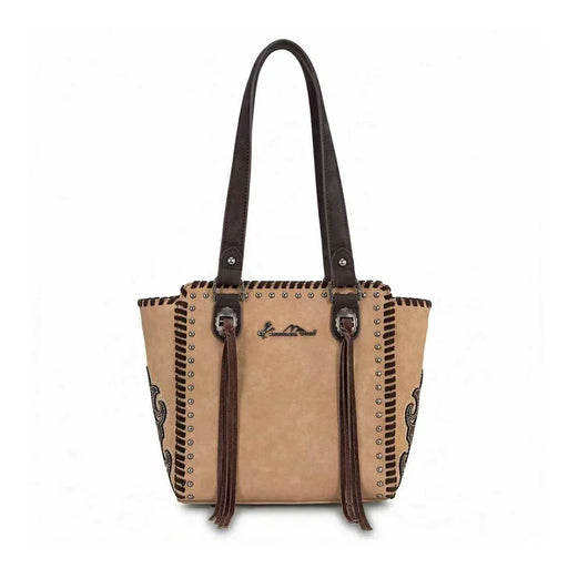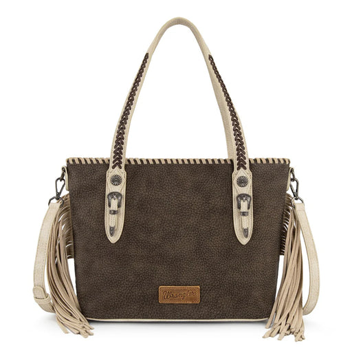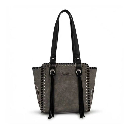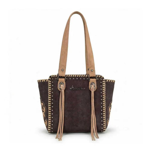 Made of PU leather Braided stitching on handles and top edge Western-inspired concho and antique buckle accents Stylish fringe detailing on both s...