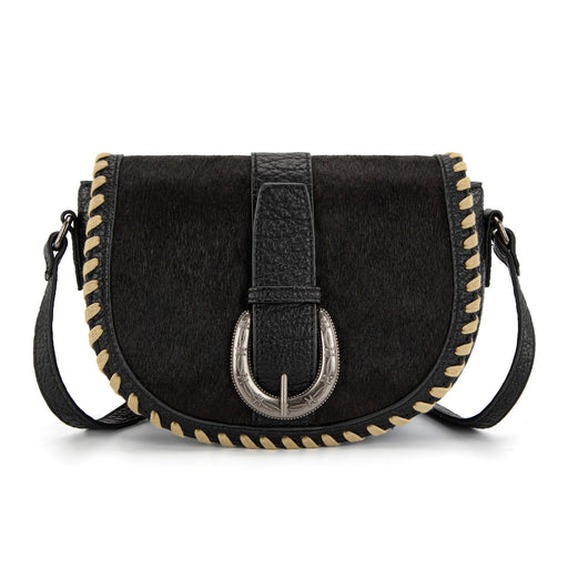 Genuine hair-on cowhide front (each piece will vary in pattern) Whipstitch edge detailing Antique silver horseshoe buckle accent Magnetic snap fla...