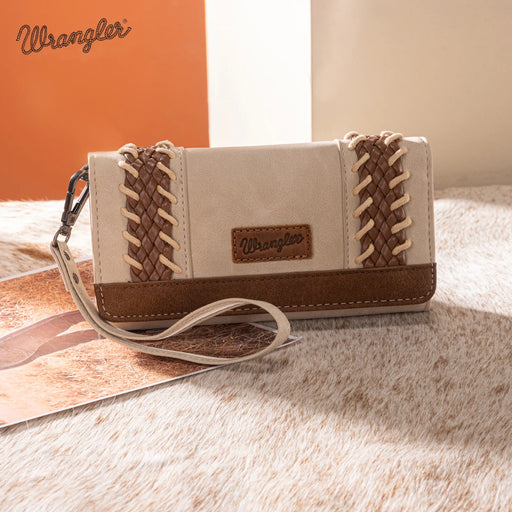 Braided and whipstitch accent details on front Wrangler logo patch Button snap closure Interior features multiple card slots ,a zip pocket and b...