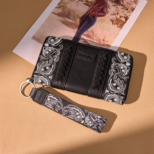 Wrangler Paisley Print Wallet Embroidered paisley with western-inspired whipstitch detailing Signature Wrangler® logo applique on the front Zipper...
