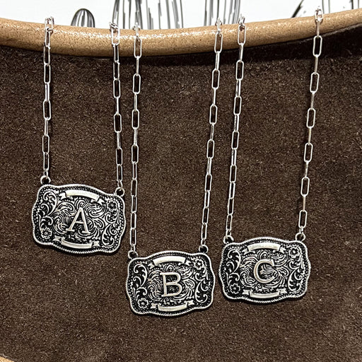 Initial Buckle Pendant Necklace.Approx: 18" .Pendant size: 1.5" x 1".Lobster claw closure with extending hooks.Lead & nickel compliant