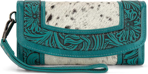 Genuine hair-on hide front and back Floral tooled trim detailing Fold-over snap closure 12card slots, 1 window ID, 2 full-length bill compartments...