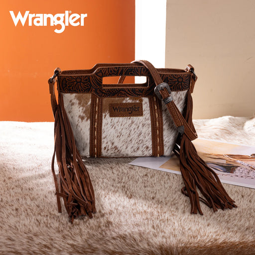 Wrangler Genuine Cowhide Top Handle Fringe Crossbody Genuine hair-on cowhide Vintage floral tooled  Saddle stitch Leather fringe Floral tooled yop...