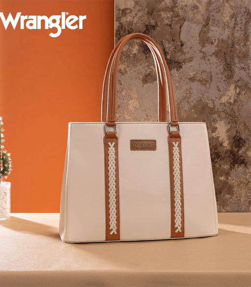 Wrangler Dual Compartment Carry All Tote Whipstitch details Wrangler logo applique on the front Dual zipper compartment Inside of the bag includ...